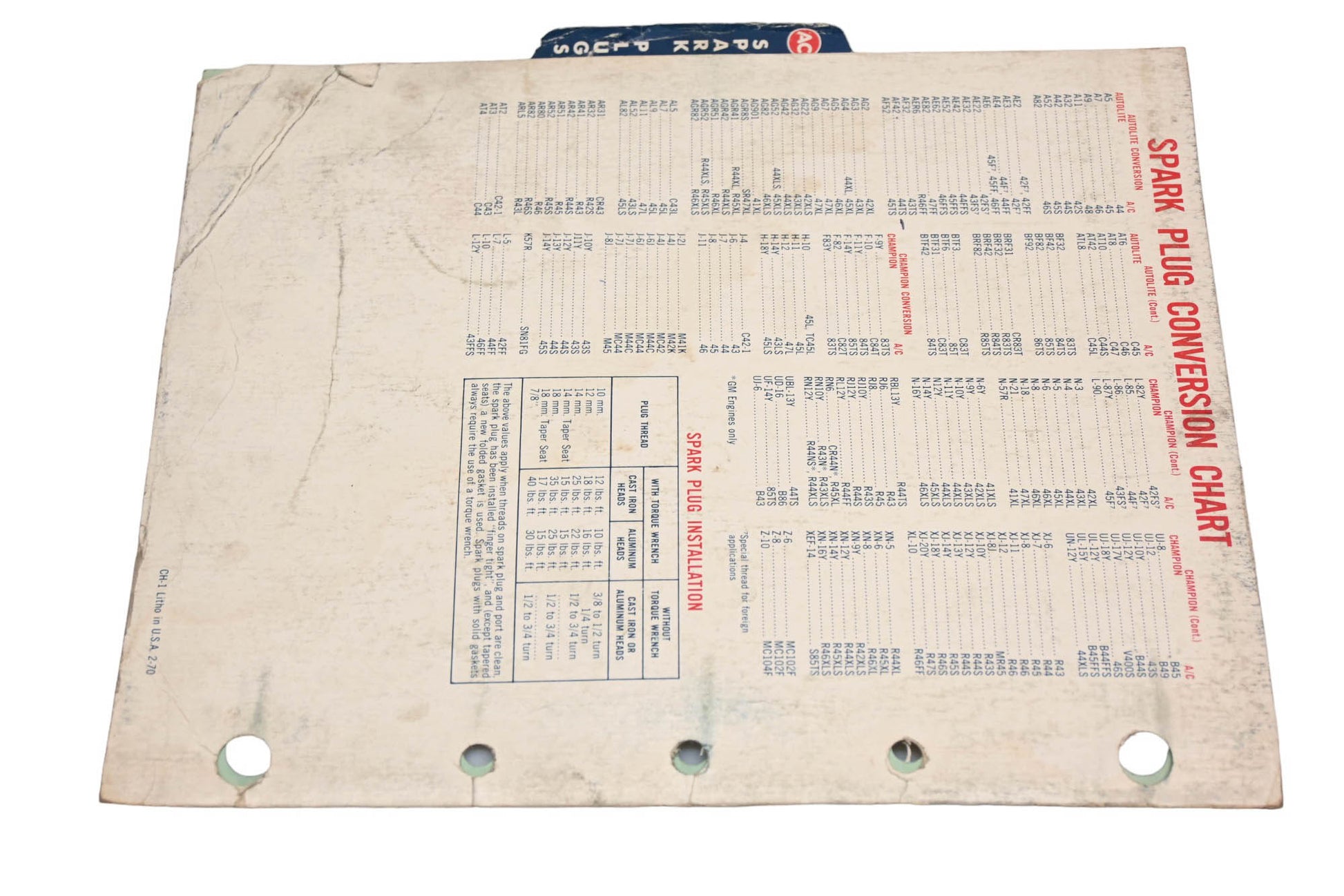 General Motors Spark Plug Specification Chart is used and in fair condition, not in original packaging. Shows signs of wear from use. Chart has a print date of 2/1970.