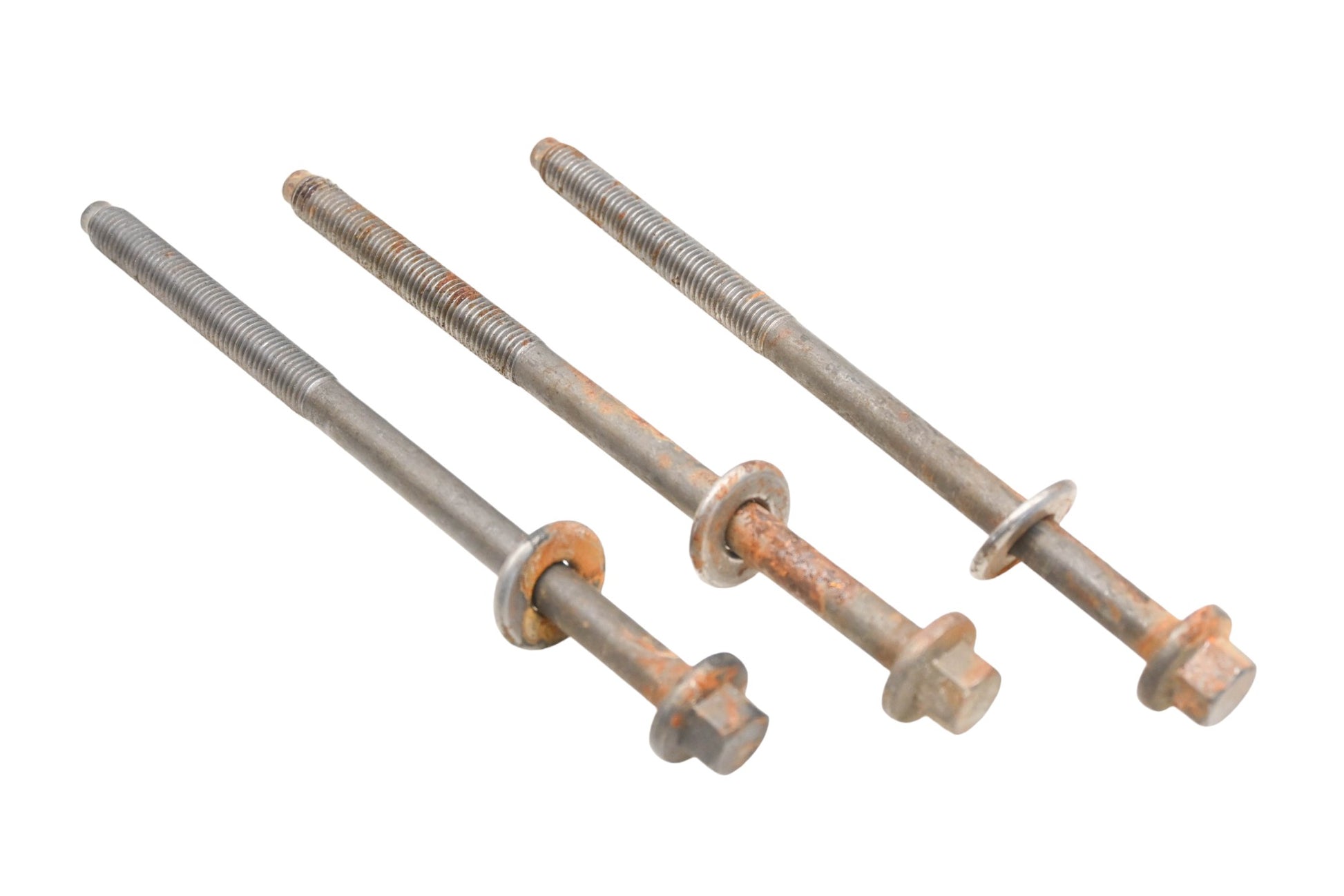 3 Hex Flange Bolts M14-1.75 x 200 Grade 8s are new and in fair condition, not in original packaging. Shows signs of shelf wear, rust present. Bolt has 15mm hex flange head, is partial threaded 90mm M14-17.75, total length is 200mm.