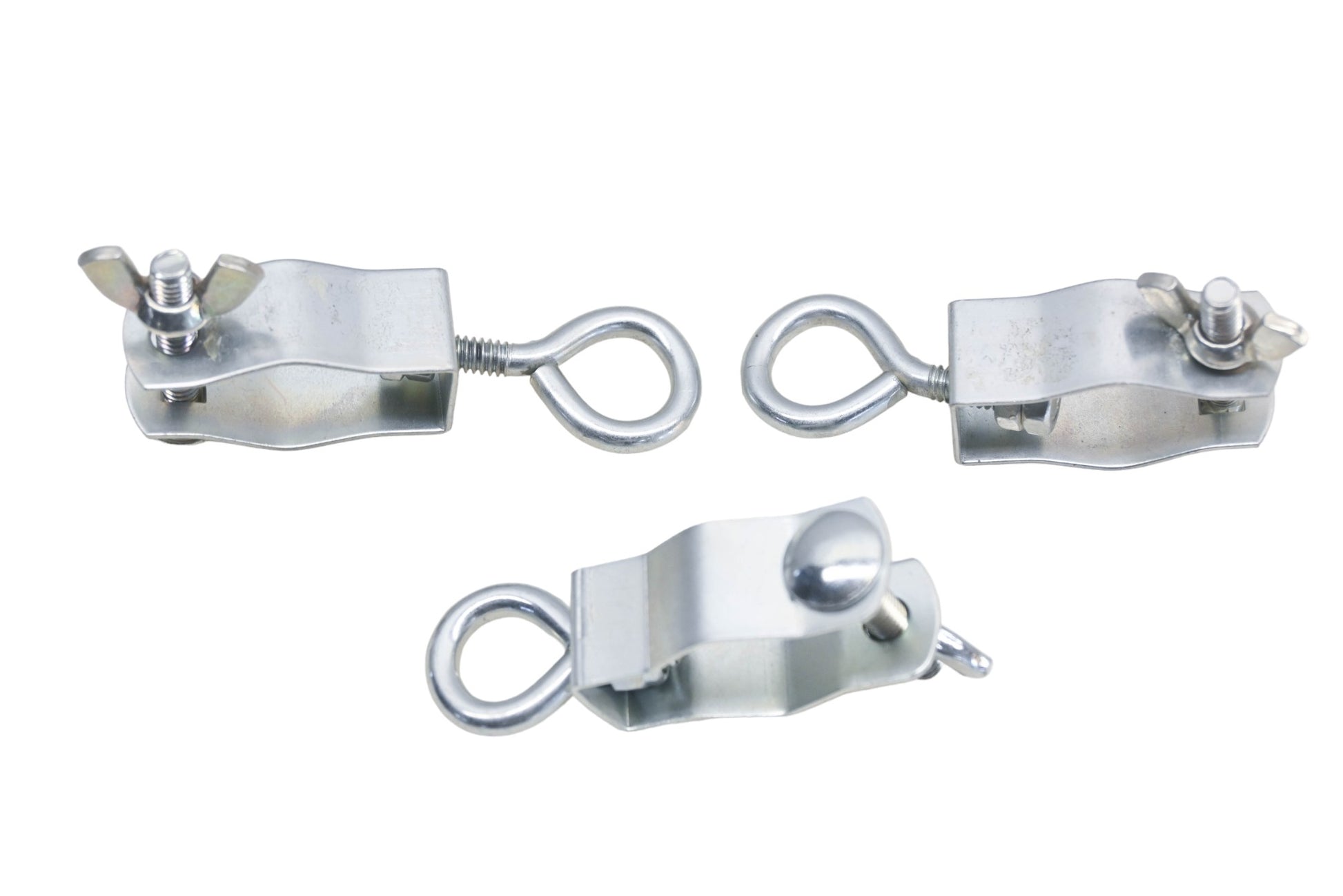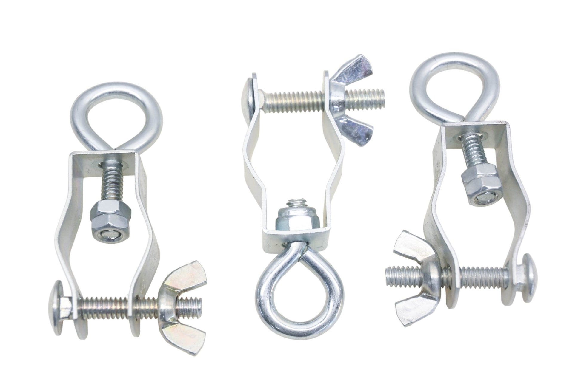 3 1" Hangar Clamp Assemblies are new and in good condition, not in original packaging. Clamps have a 1" opening that can be tightened to 3/4". Eyebolt opening is 1/2" wide.