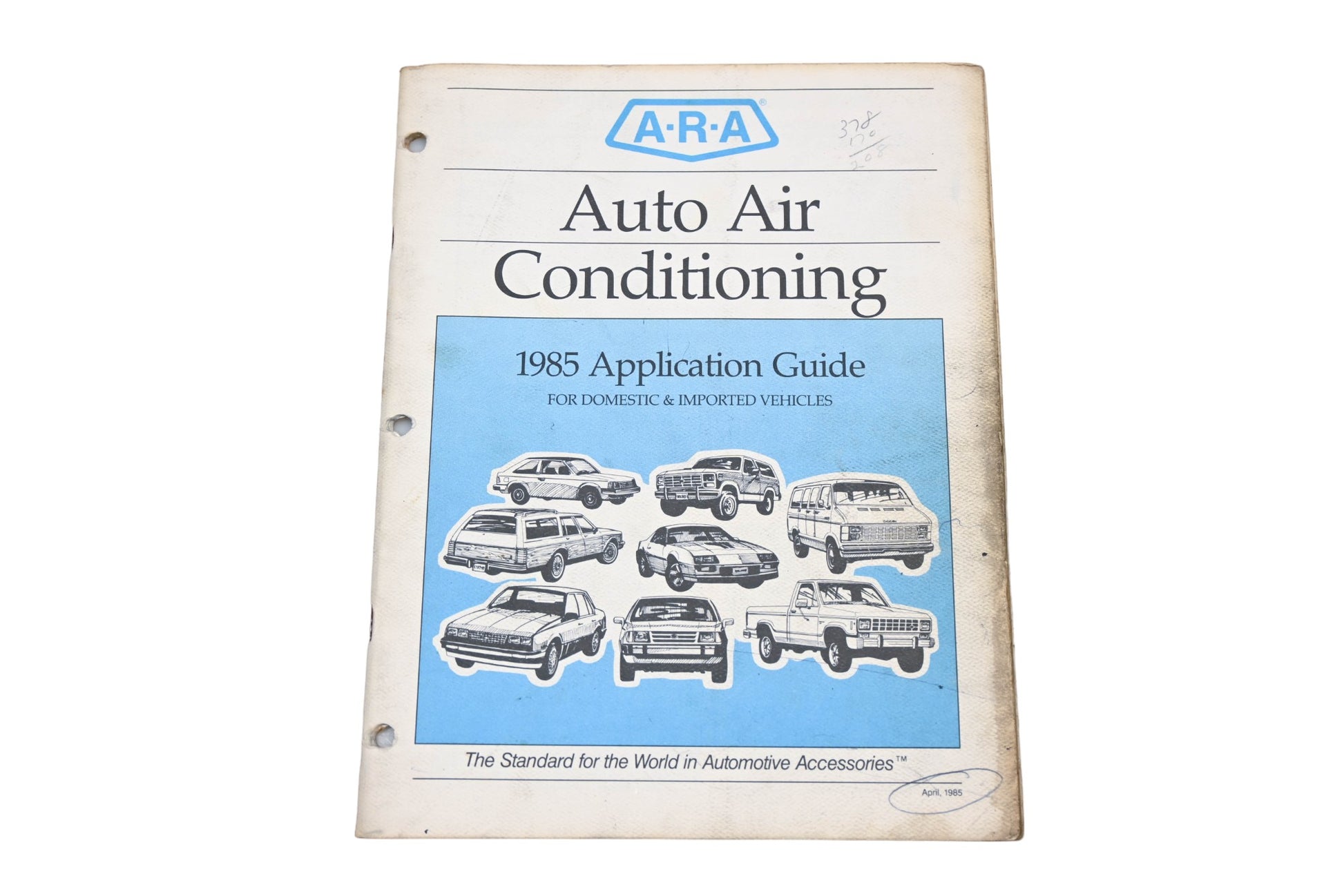1985 Auto Air Conditioning Application Guide is used and in good condition, not in original packaging. Shows signs of wear from use. Has rips, minor staining and handwritten notes.