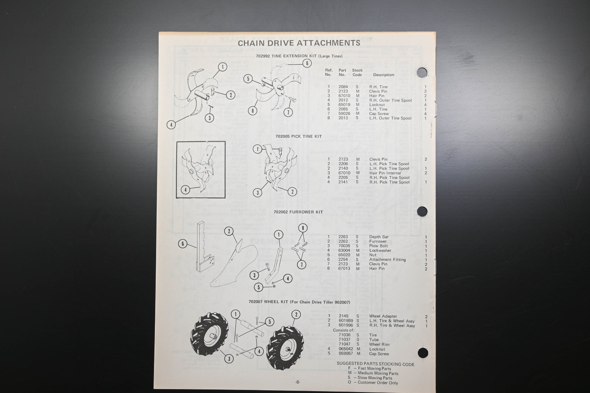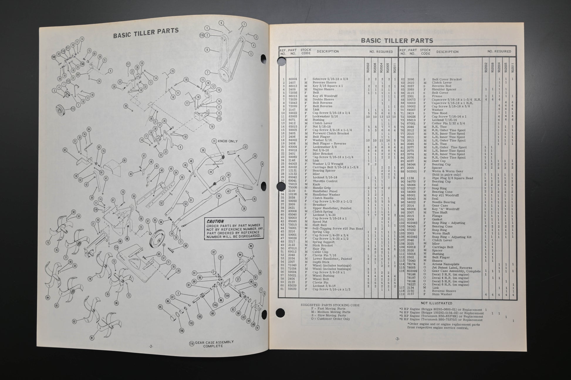 Rotary Tiller Parts Manual is used and in good condition, not in original packaging. Shows signs of wear from use. Pages discolored & binding staples are rusted.