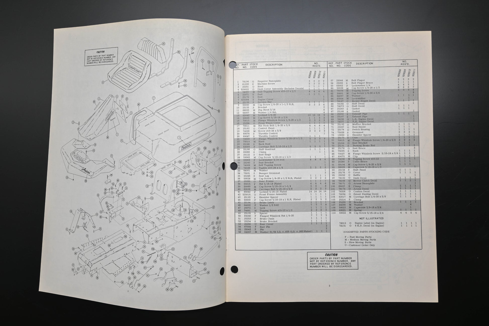 Emperor Tractor & Attachments Parts Manual is used and in good condition, not in original packaging. Shows signs of wear from use. Pages discolored & binding staples are rusted. Front cover lightly stained.