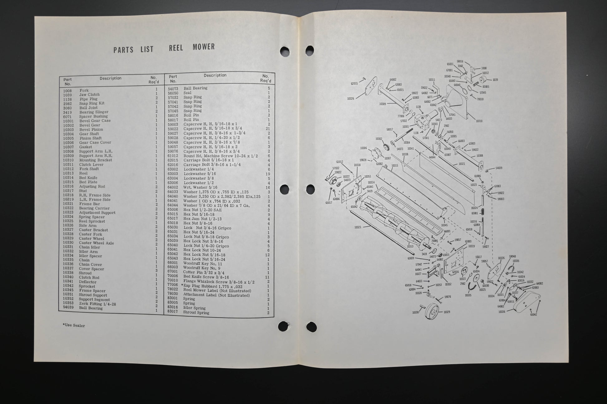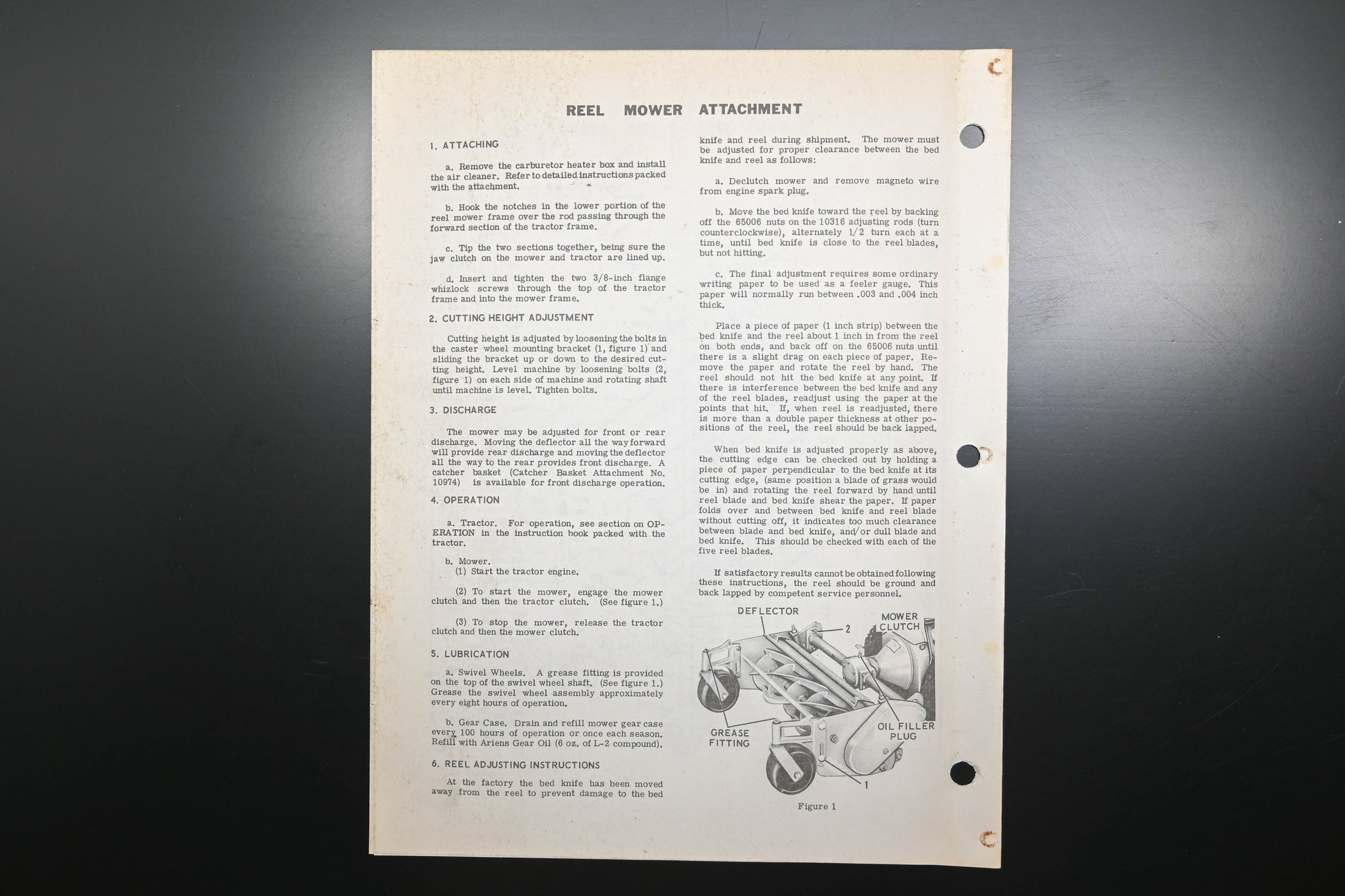 Reel Mower Attachment Operating Instructions & Parts List is used and in good condition, not in original packaging. Shows signs of wear from use. Pages discolored & binding staples are rusted. Back page has some rust stains present.