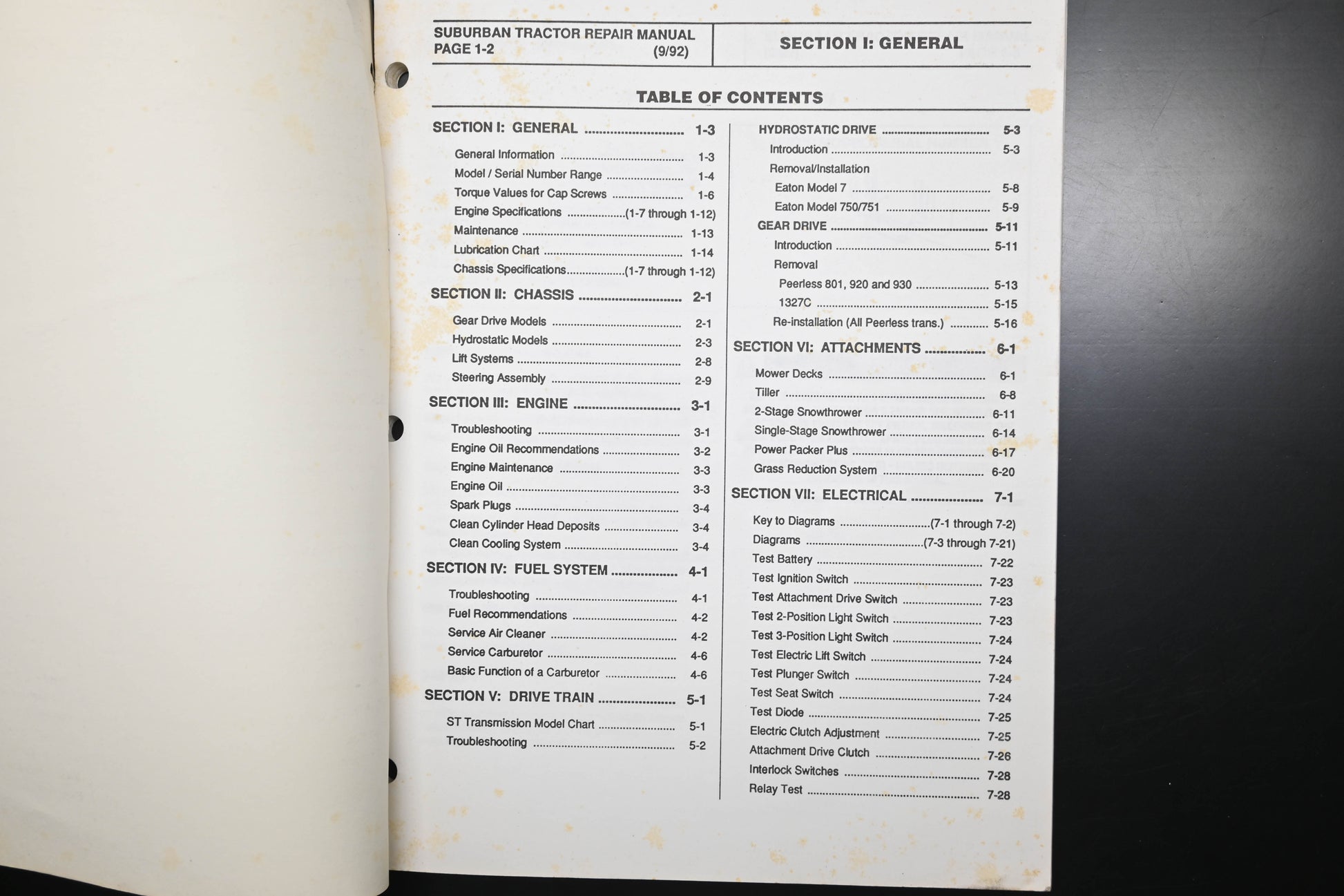 Suburban Tractor Service & Repair Manual is used and in good condition, not in original packaging. Shows signs of wear from use. Binding staples rusted and pages discolored from age. Fingerprints and stains present on both covers and several pages.