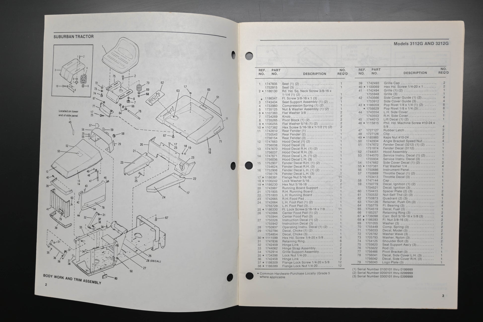 Suburban Tractor Models 3112G 3212G Parts List is used and in good condition, not in original packaging. Shows signs of wear from use. Binding staples rusted and pages discolored from age. Fingerprints present on front cover.