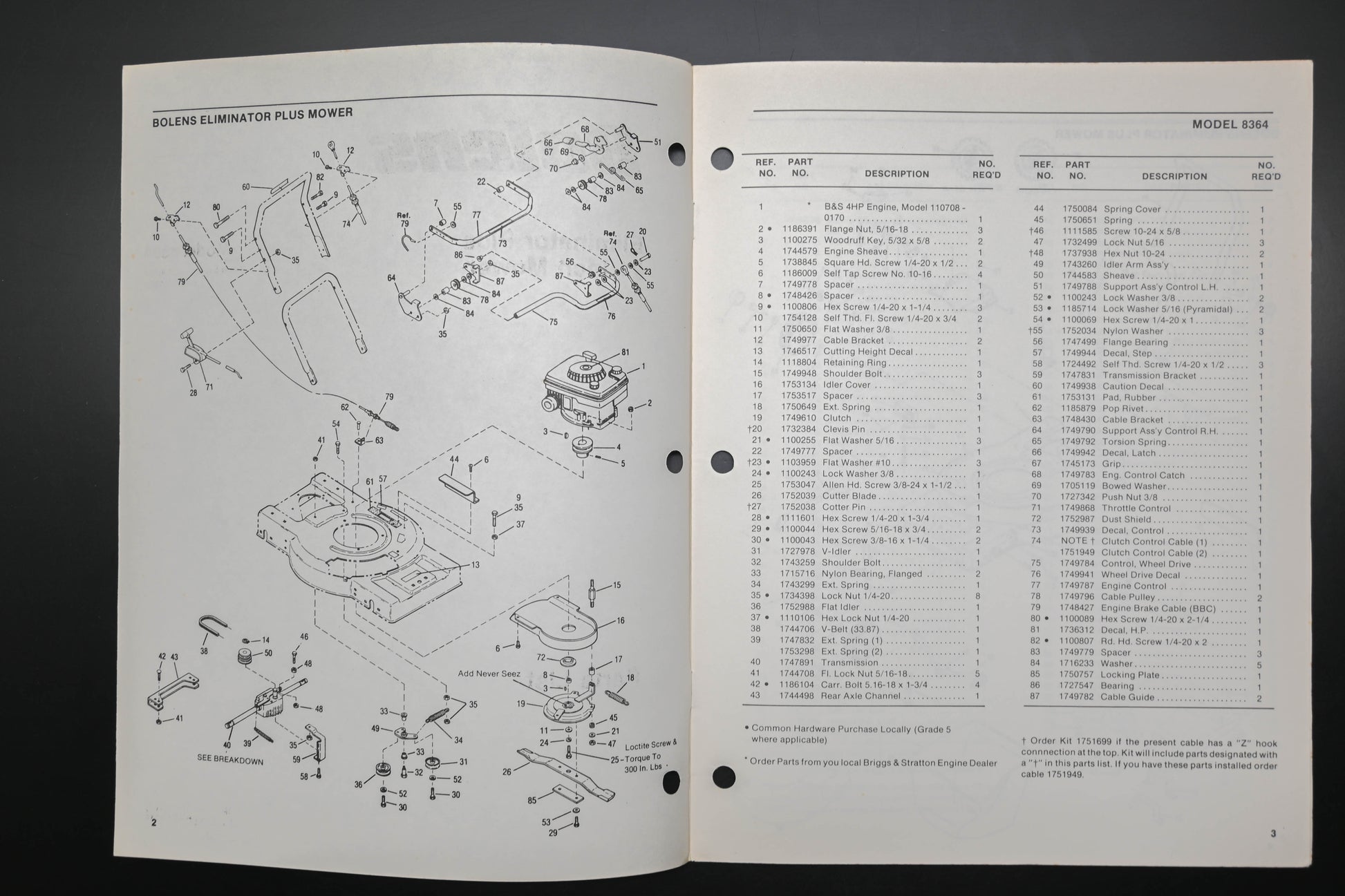 Bolens P-4019-1 87 Eliminator Plus 21" Mower Model 8364 Parts List