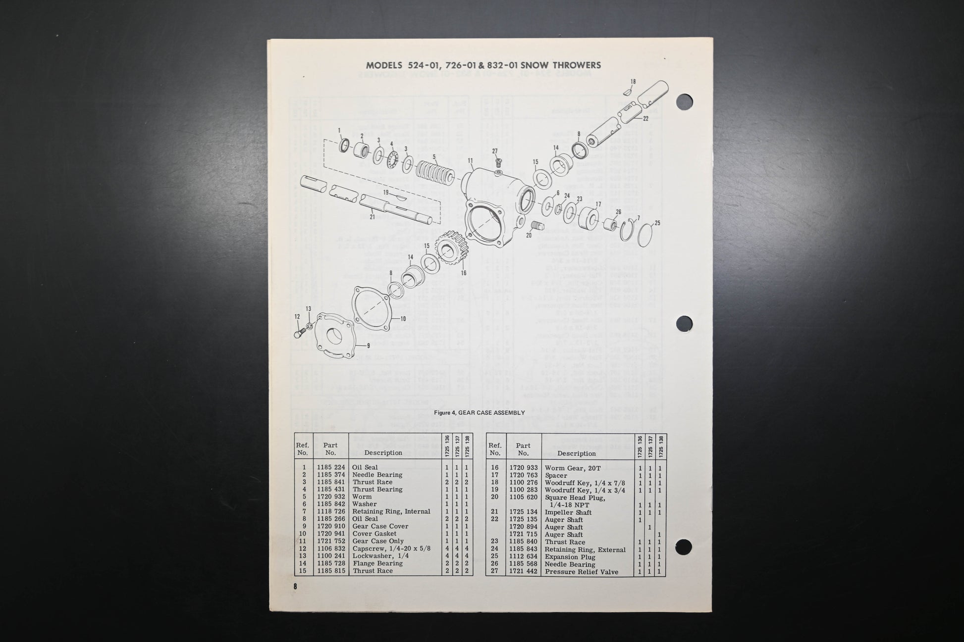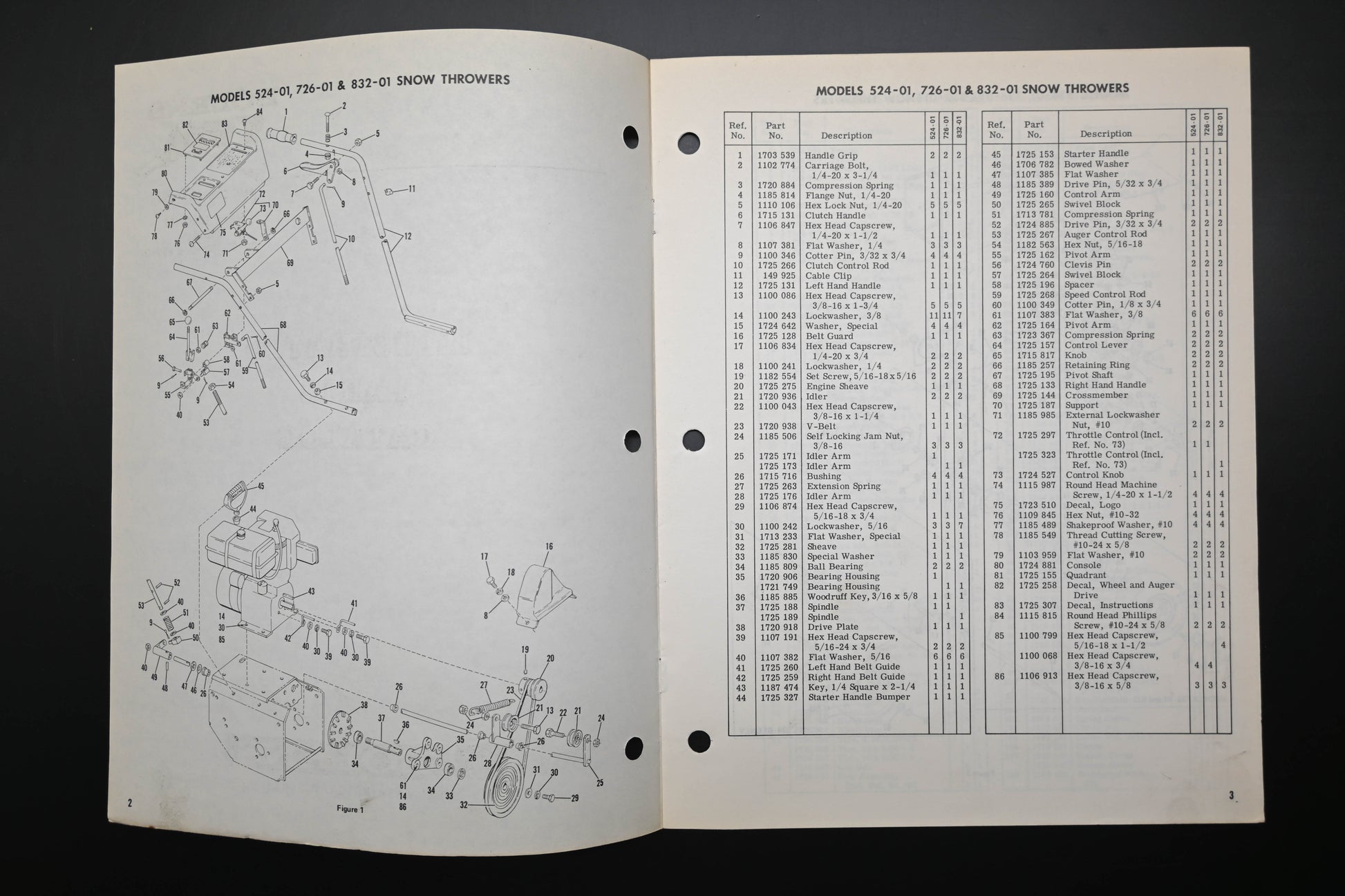 Snow Thrower Models 524-01 726-01 832-01 Parts Catalog is used and in good condition, not in original packaging. Shows signs of wear from use. Binding staples rusted and pages discolored from age. Fingerprints present on both covers and several pages.
