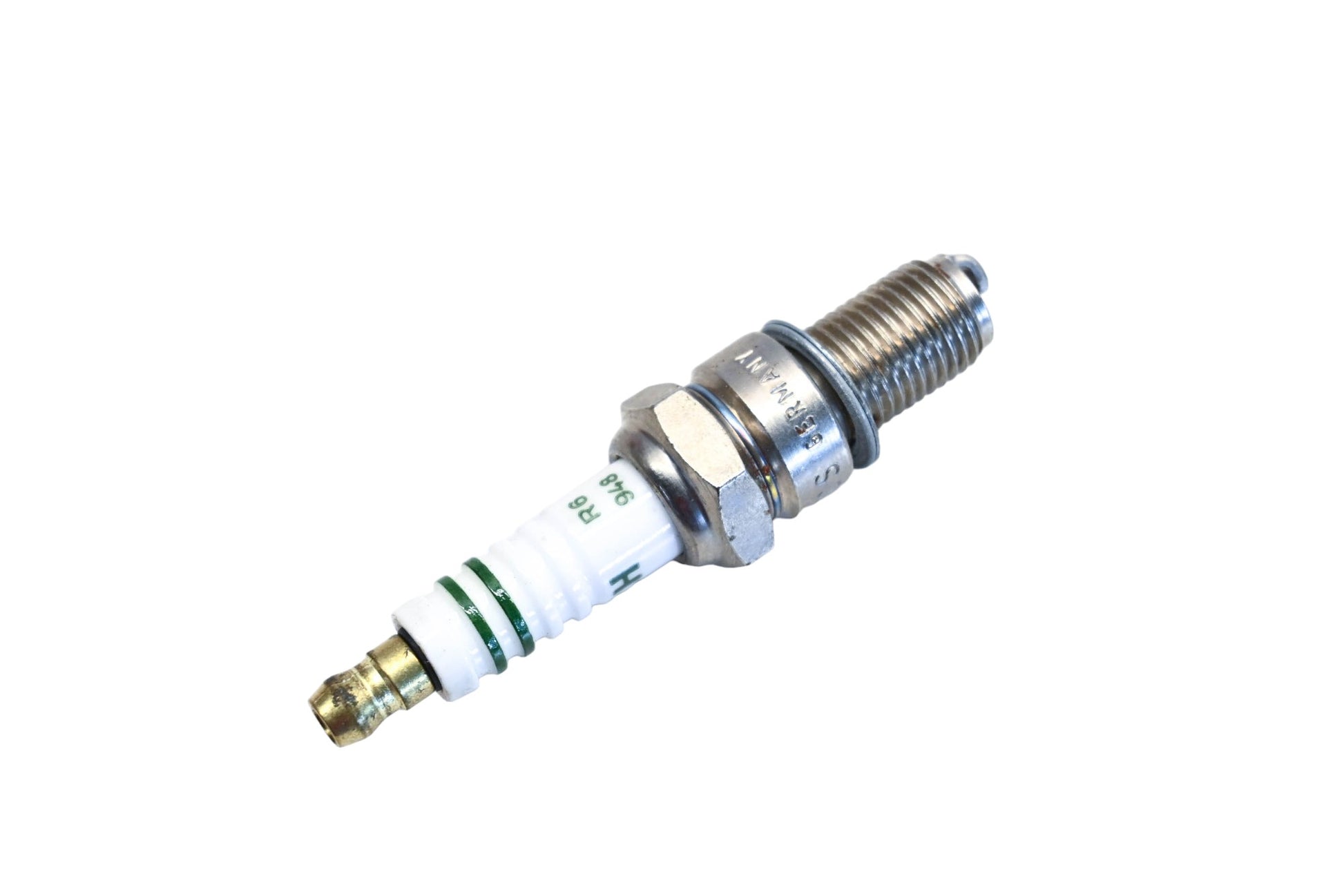 Silver Spark Plug is new and in good condition, in original packaging. Shows signs of shelf wear. Rust present.