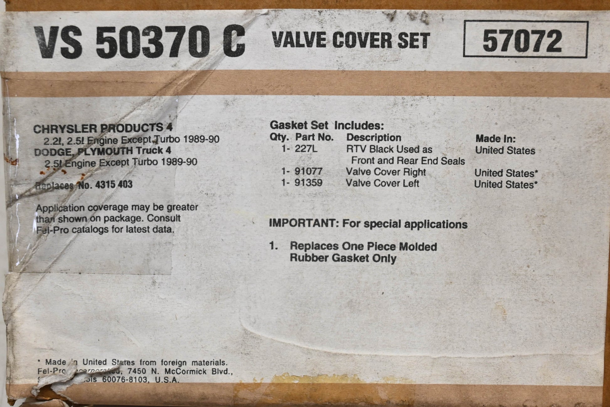 Valve Cover Gasket Kit is new and in good condition, in original packaging. Shows signs of shelf wear. Gaskets are folded, no cracks.