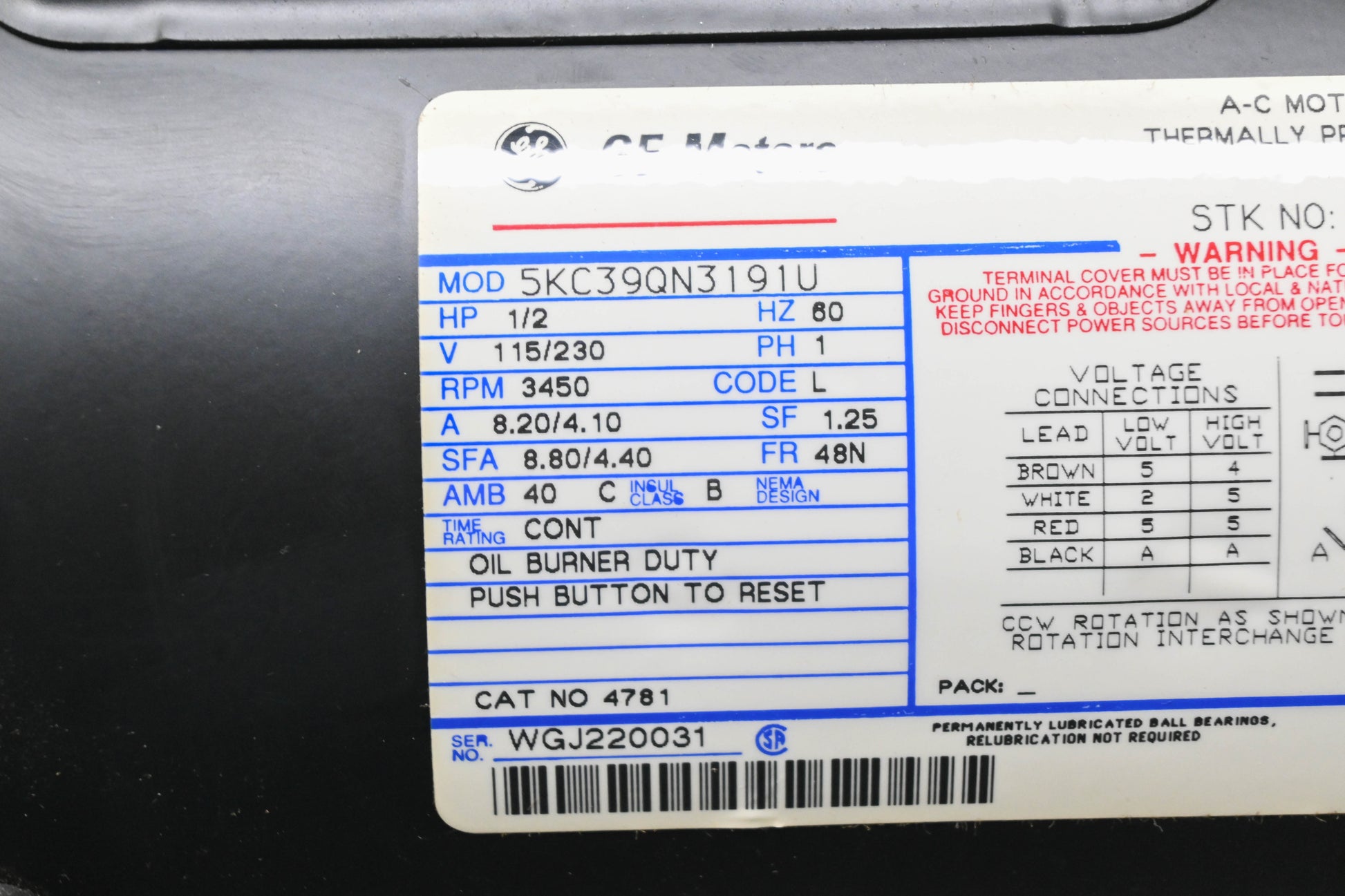 General Electric 5KC39QN3191U 1/2HP 115V/230V 3450RPM Electric Motor