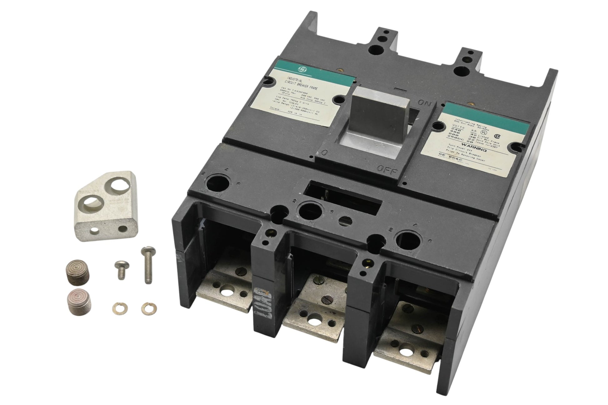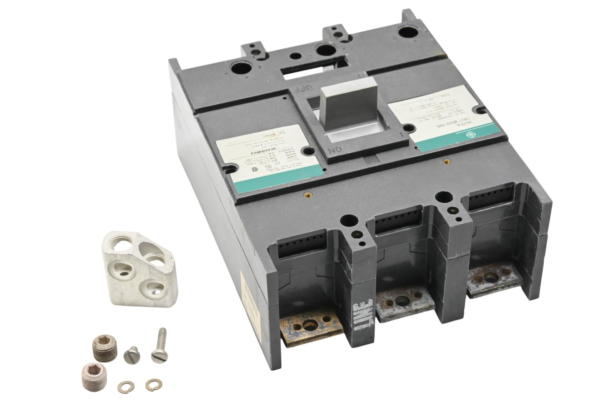 600 Volt 600 Amp Circuit Breaker is new and in good condition, in original packaging. Shows signs of shelf wear. Oxidation present on line side lug connectors.