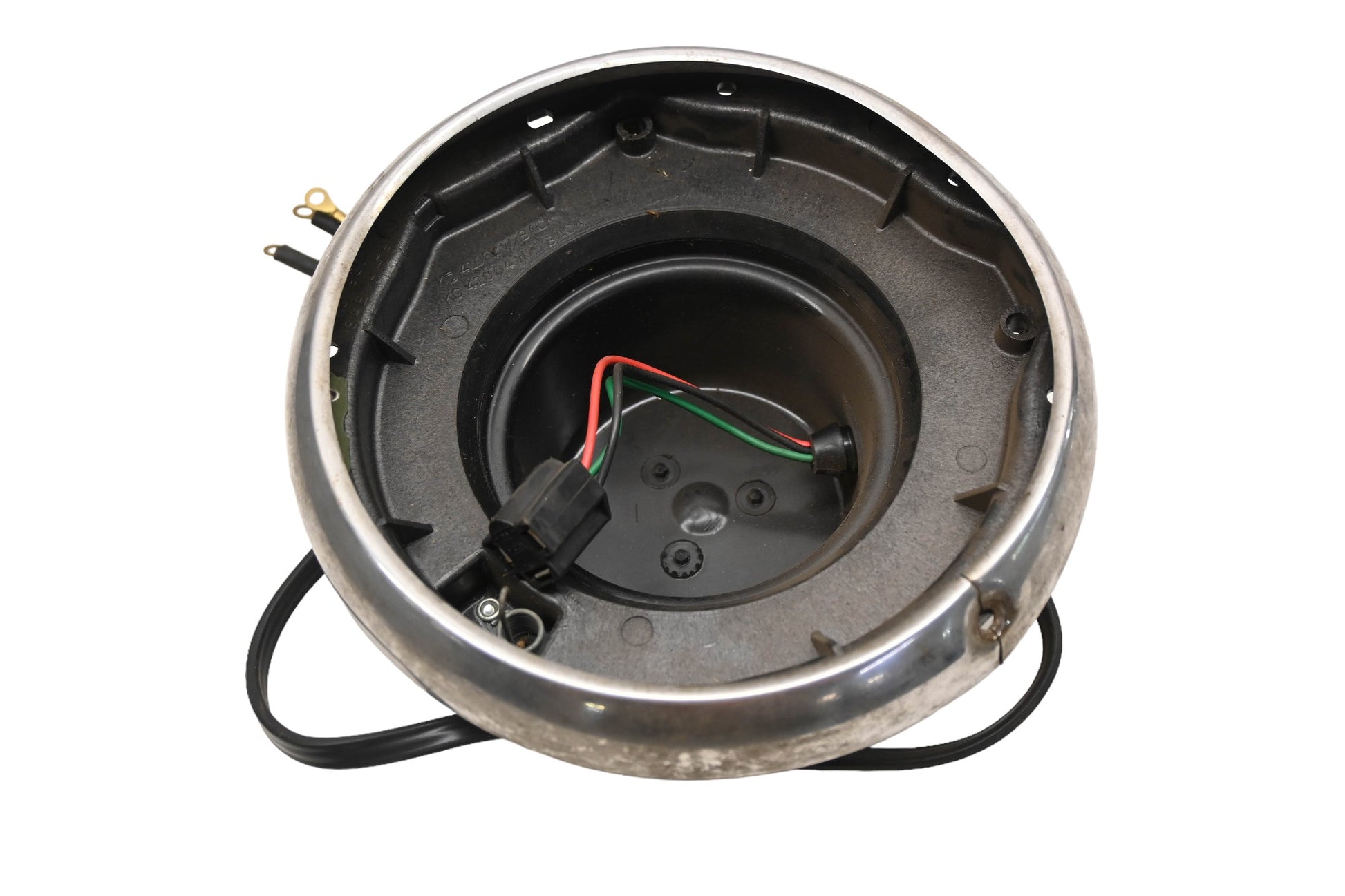 Headlight Housing With Trim is used and in fair condition, not in original packaging. Ring and housing both have signs or wear. Sale is for housing and trim ring, bulb not included.