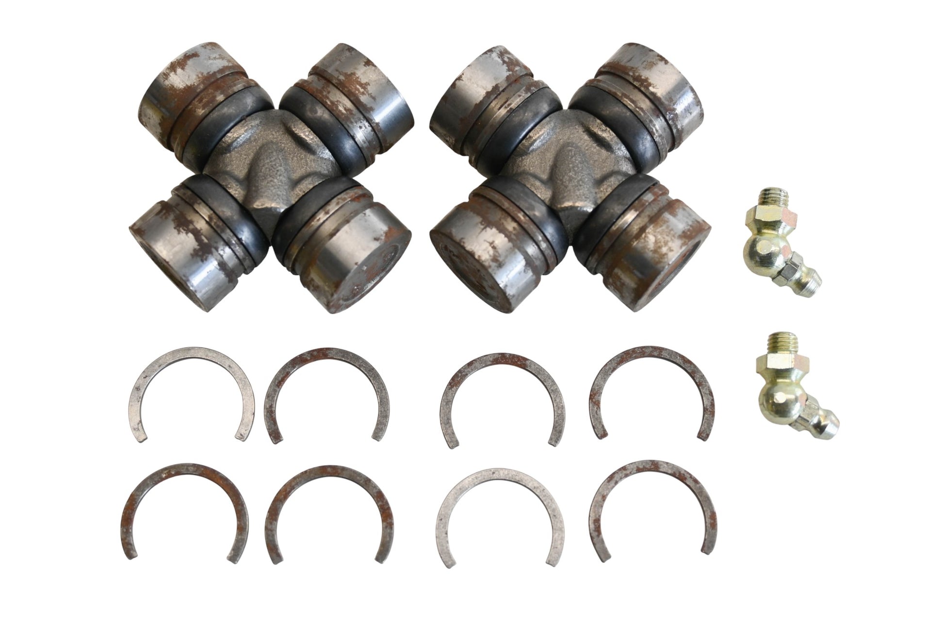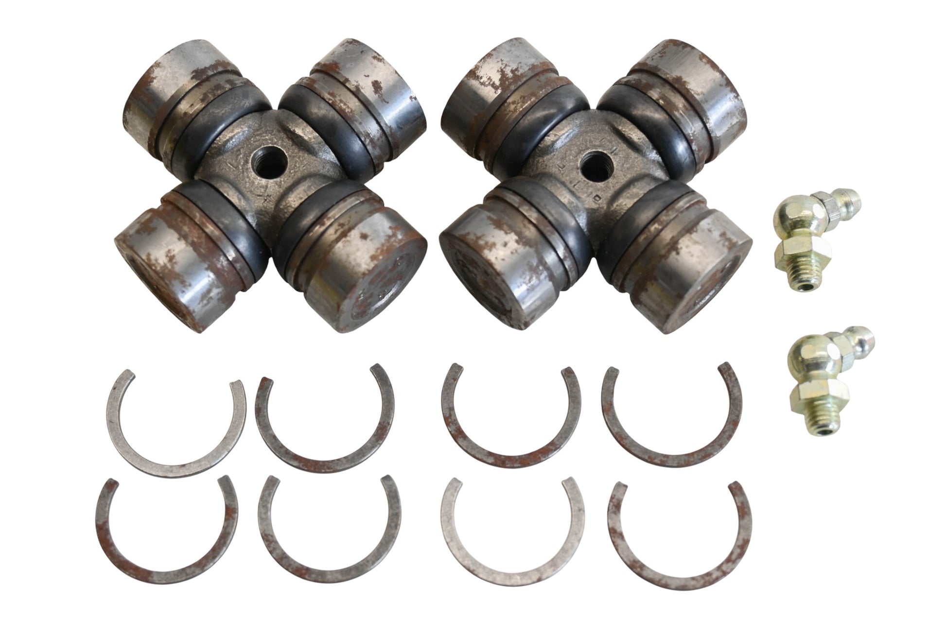 2 U-Joints are new and in good condition, not in original packaging. Shows signs of shelf wear. Rust present. U-Joint Bearings spin freely.