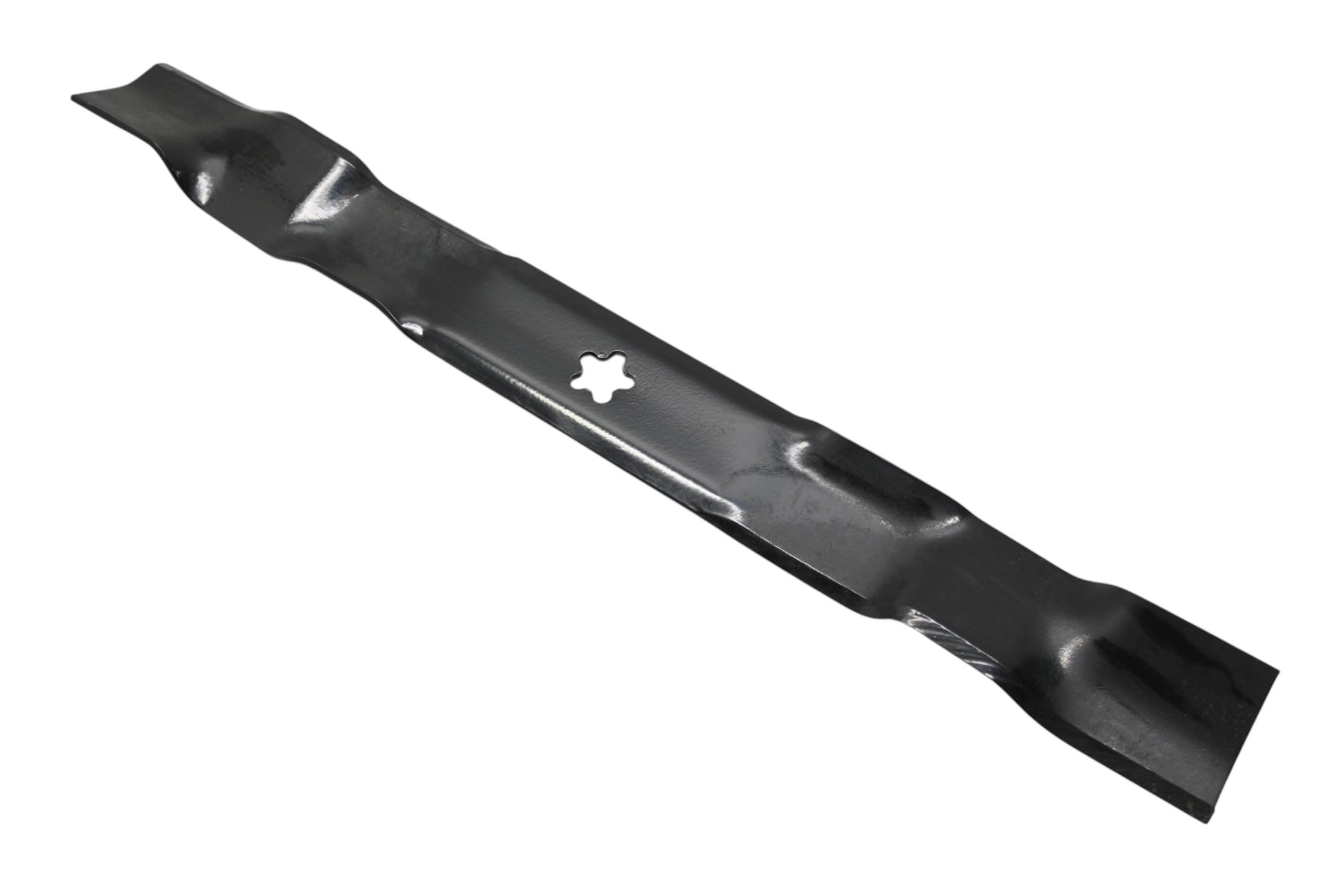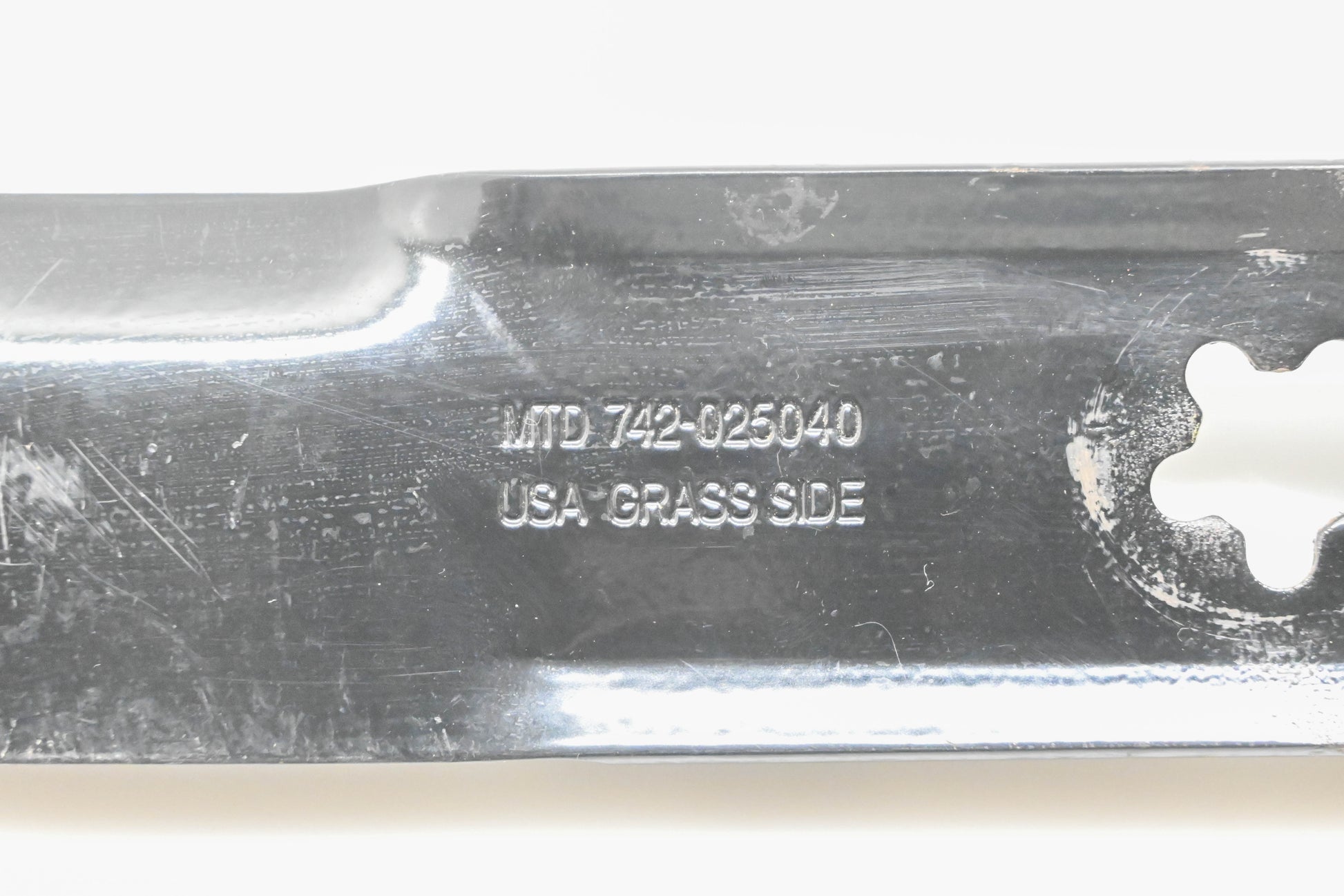 21" Mulching Blade is new and in good condition, not in original packaging. Shows signs of shelf wear. Paint chipped in a few spots with surface rust present.