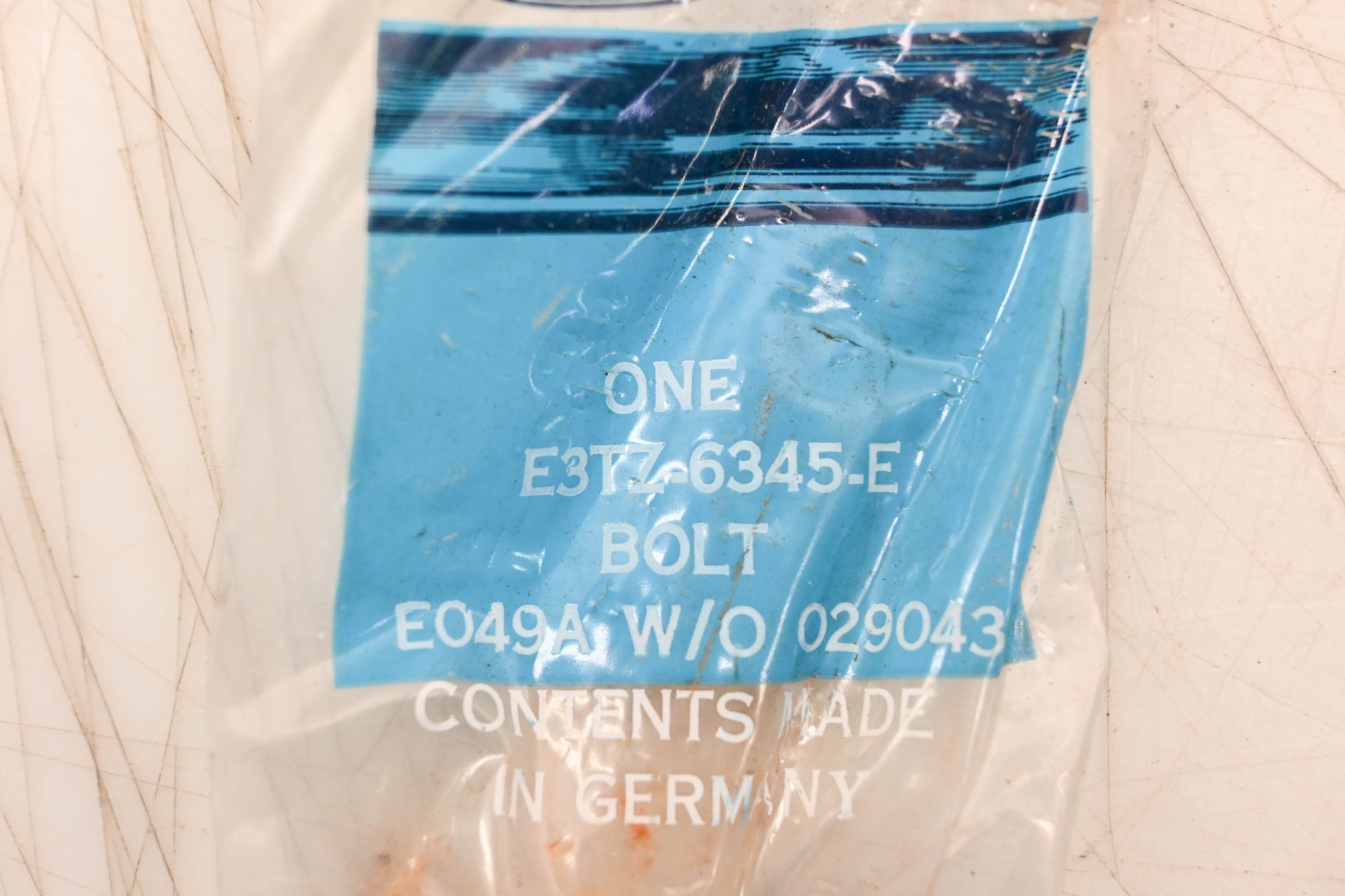 Main Crankshaft Bearing Cap Bolt is new and in good condition, in original packaging. Part shows some signs of shelf-wear; rust appearing in several places.