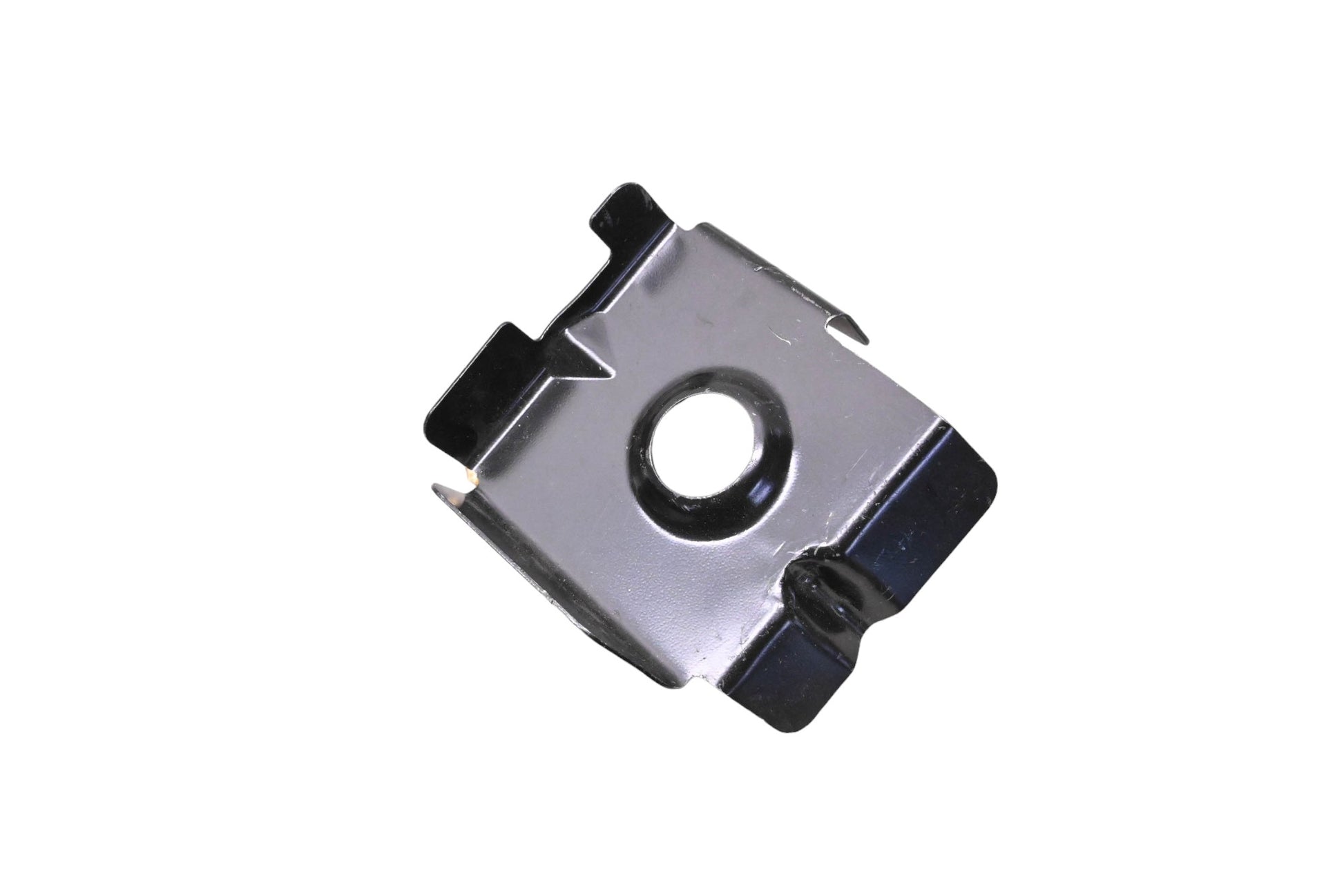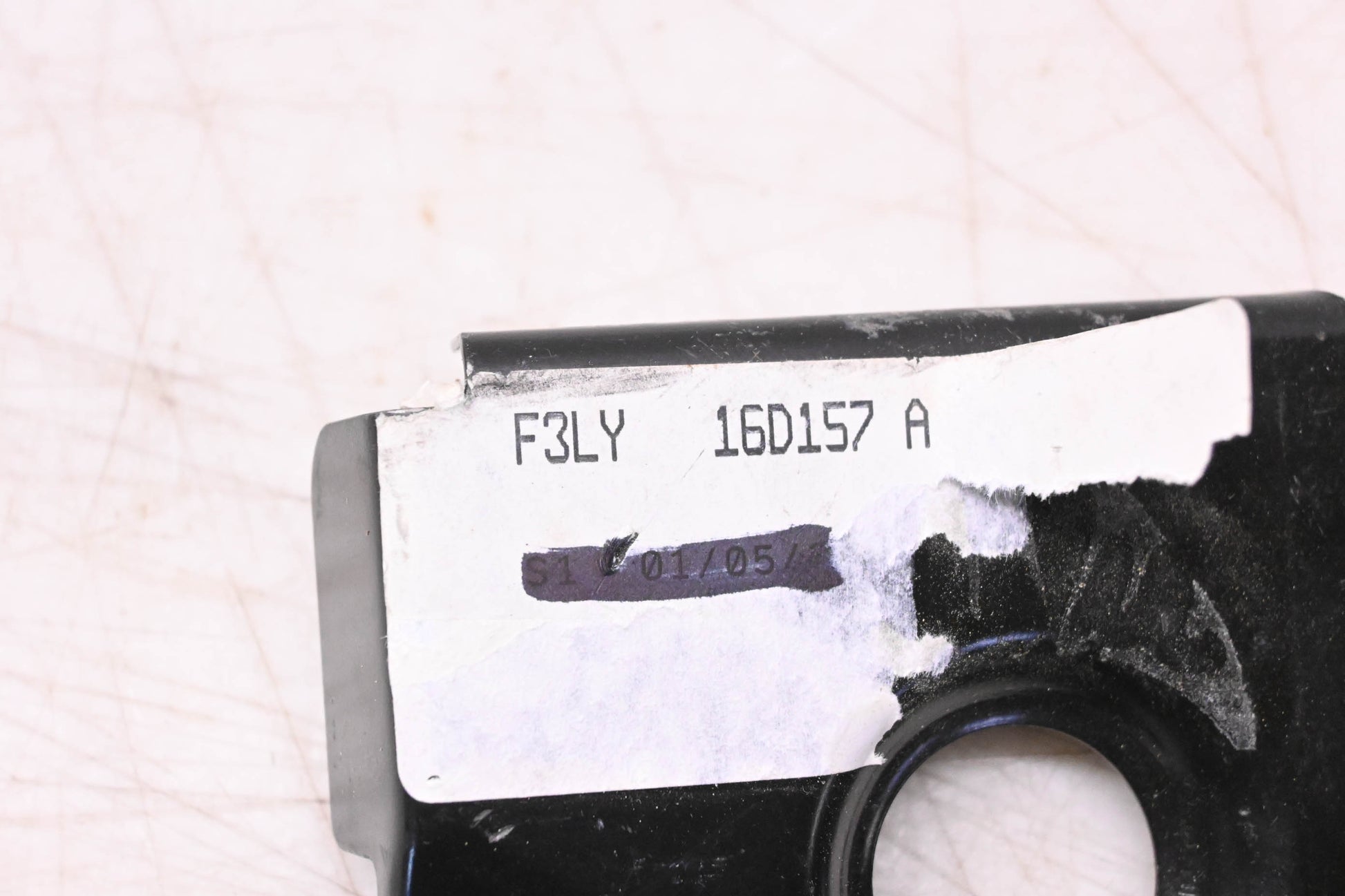 Left Side Fender Mounting Bracket is new and in good condition, not in original packaging. Part shows some signs of shelf-wear; some sticker residue present.