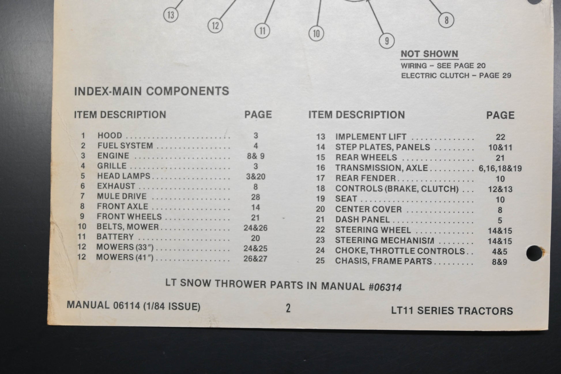 LT11 Tractor & Attachments Parts Manual is used and in good condition, not in original packaging. Shows signs of wear from use. Pages discolored. Fingerprints present throughout.